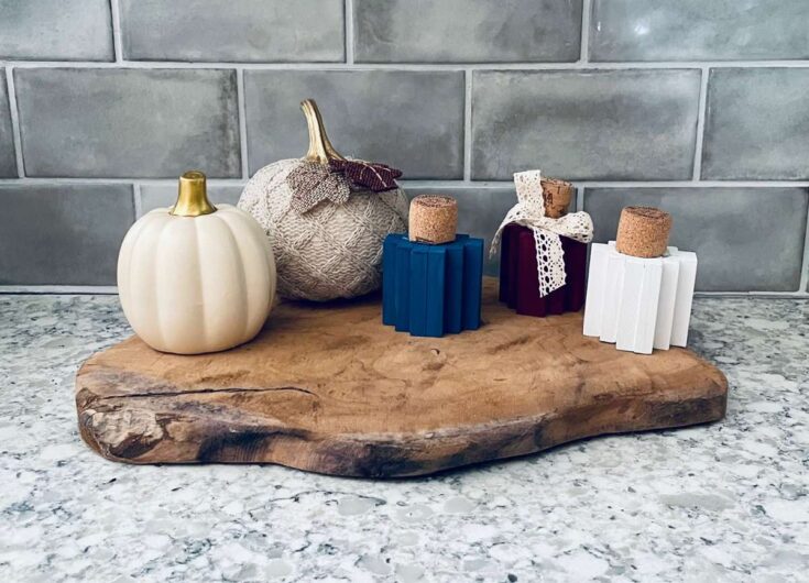 Check out how to use Jenga pieces to make cute wood pumpkin farmhouse decor? All the supplies are from the Dollar store!