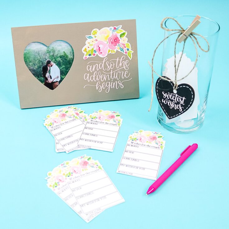 This post shares a handful of cute wedding ideas with a fun decorated wood frame from the Dollar Store. With a Cricut machine, some Dollar Store supplies and a little creativity, you can create these ideas too.
